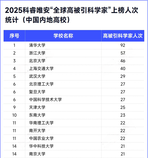 表2:2025中国内地高校全球高被引科学家入选人次统计