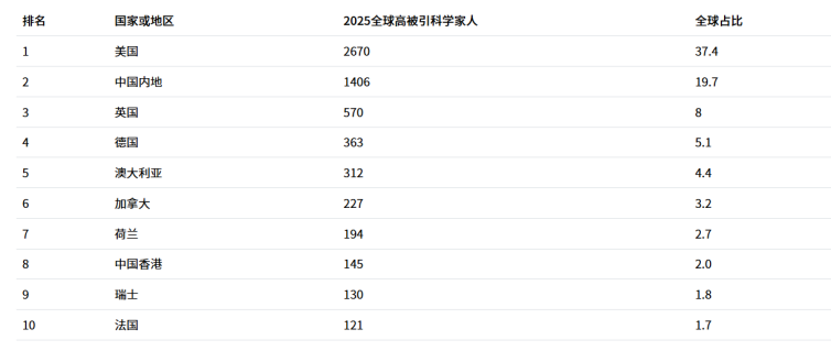 表1:2025年度全球高被引科学家上榜人次前十的国家或地区